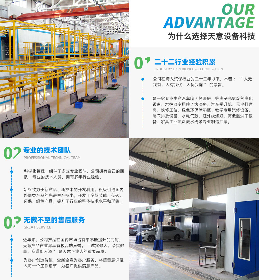 山东天意设备科技有限公司坐落于山东省邹平县城黄山五路西首,是一家专业生产喷漆流水线、喷涂流水线、涂装流水线、汽车喷/烤漆房、等离子光氧废气净化设备、水性漆专用喷/烤漆房、汽车举升机、无尘打磨房、快修工位、绿色环保除漆柜、教学专用汽修设备、尾气排放设备、水电气鼓、红外线烤灯、高低温烘干设备、家具工业喷涂流水线等专业制造厂家。其中烤漆房加热方式有油、电、气、导热油,举升机分双柱举升机、龙门举升机、四柱举升机。